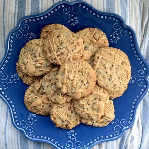 These cookies are the cookies of the summer. They are chocolate chips cookies made yummier by the salty taste of the Skor’s Chipits, then the added butterscotch drizzle balances it all again.