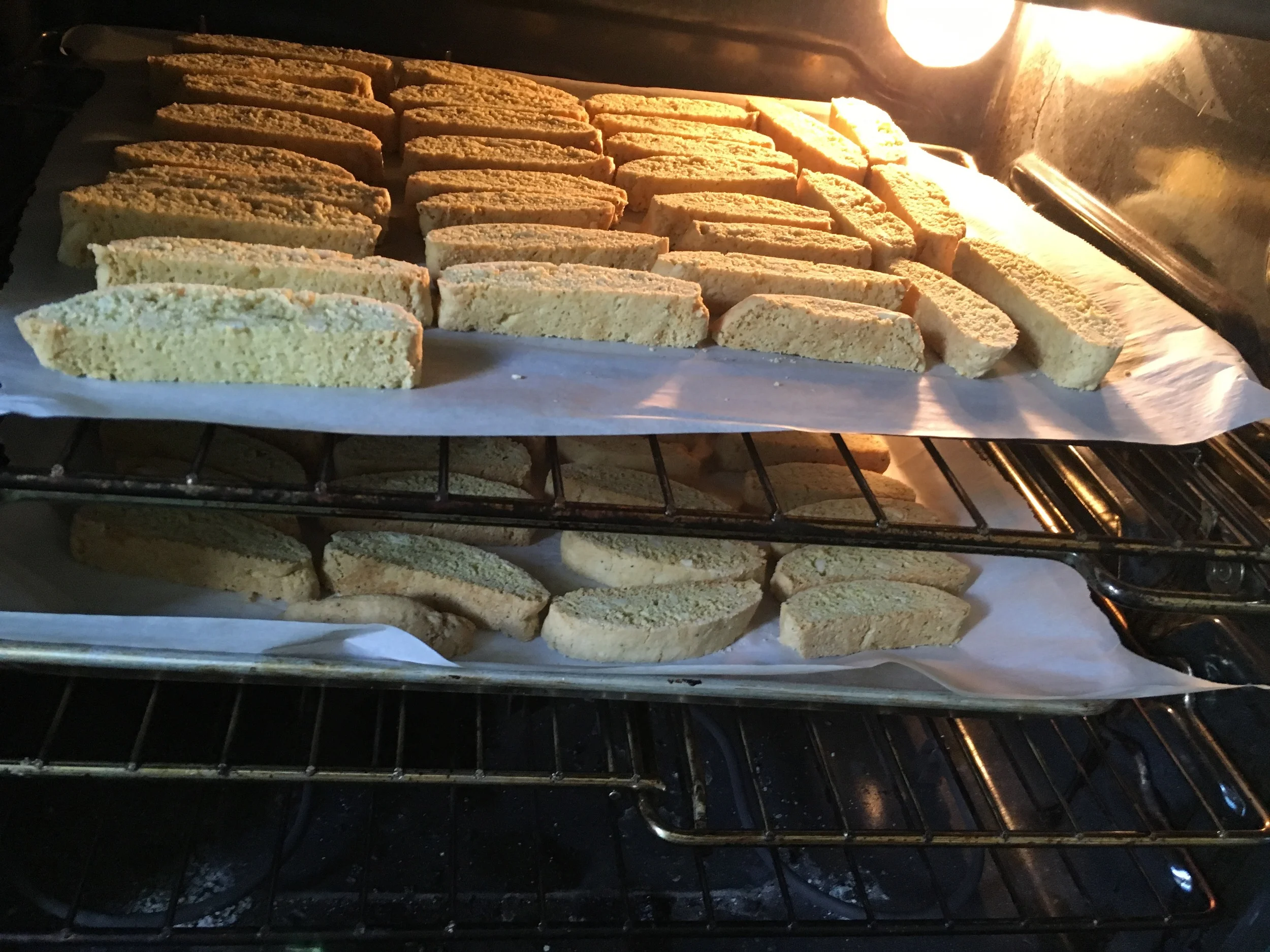 Form two logs of equal proportions and bake in a 375 ° oven for 25 minutes on a parchment covered sheet pan.