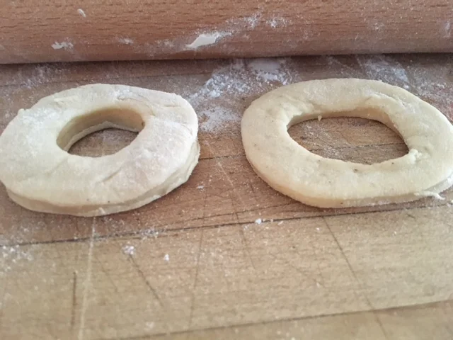 Divide dough in 8 equal parts. Roll out each portion 1/3-inch-thick on a lightly floured surface, add as much flour you need to keep the dough from sticking. Cut with a floured doughnut cutter and set the uncooked doughnuts aside, let them rest 5 minutes before cooking.